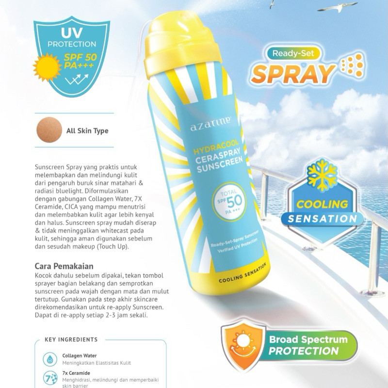Sunscreen Spray yang praktis untuk melembabkan dan melindungi kulit dari pengaruh buruk sinar matahari & radiasi bluelight. Diformulasikan dengan gabungan Collagen Water, 7x Ceramides dan CICA pada kulit serta melembabkan agar kulit kenyal dan halus. Sunscreen spray mudah diserap & tidak meninggalkan whitecast pada kulit, sehingga aman digunakan sebelum dan sesudah makeup
