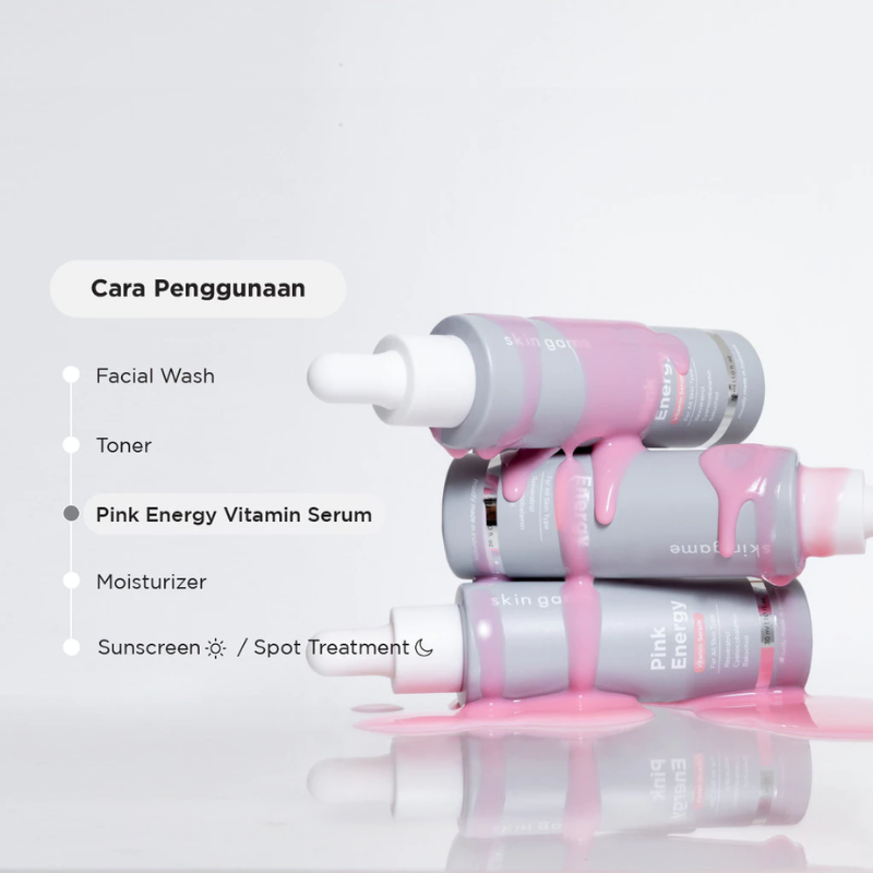 Pink Energy Vitamin Serum adalah vitamin serum yang berwarna pink mudah menyerap yang bermanfaat untuk memperkuat imunitas kulit dengan kandungan niacinamide, bakuchiol, vitamin B12, dan resveratrol.