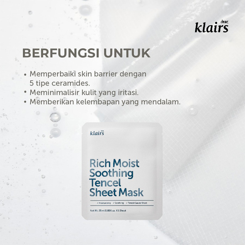 Everything you love about Klairs’ Rich Moist line, now in a soothing, cooling, calming mask, perfect for sensitive, troubled, or reactive skin types. Klairs Rich Moist Soothing Tencel Sheet Mask features ceramide and Centella asiatica extract help to heal and fortify a damaged skin barrier, while aloe and dipotassium glycyrrhizate soothe and calm inflamed skin. Hyaluronic acid and glycerin draw in moisture for longer lasting hydration. A double-layered, hypoallergenic Tencel gauze mask gives you the softness of a 100% cotton sheet with the enhanced benefits of better adherence to the skin to really help all those active ingredients penetrate deep within. Great for relieving dryness, irritation, and redness.