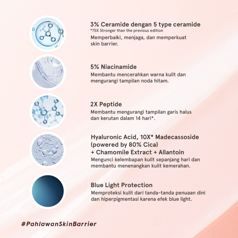 Membantu meningkatkan skin barrier, melindungi dan melawan efek blue light, melindungi lapisan terluar kulit jangka panjang, mempertahankan dan mengunci kelembapan agar kulit tampak lebih kenyal, membantu mengurangi tampilan garis halus dan kerutan, membantu mencerahkan warna kulit yang tidak merata, & membantu meminimalisir tampilan pori wajah.