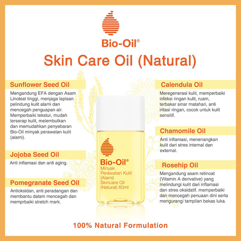 Bio-Oil Skincare Oil Natural adalah produk spesialis perawatan kulit untuk membantu menyamarkan scars dan stretch marks yang terbuat dari 100% bahan alami.