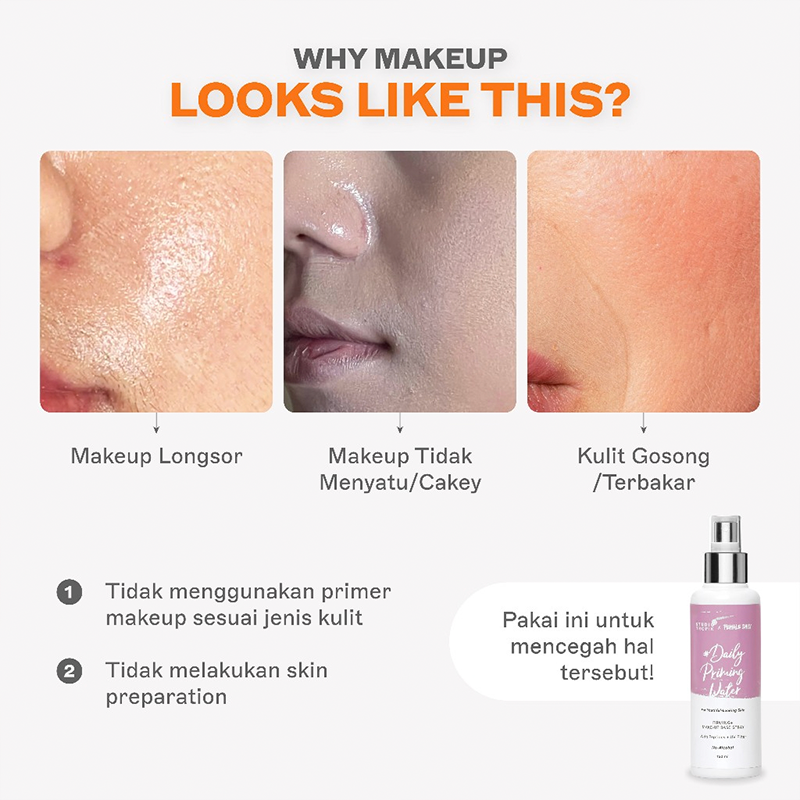 Daily Priming Water menghasilkan efek make-up yang youthful glow, tidak terlihat dempul/cakey, dan membuat make-up menyatu dengan kulit (skin-like complexion)