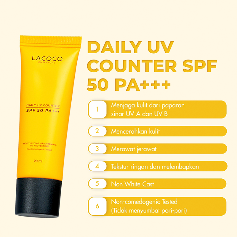 Lacoco Daily UV Counter SPF 50 PA++ merupakan pelindung kulit dari sinar UV A dan UV B. Diformulasikan tanpa silikon, Daily UV Counter memiliki tekstur ringan yang nyaman digunakan tanpa membuat kulit berminyak, dan tidak meninggalkan white cast pada kulit. Sinar UV A dan UV B dapat menimbulkan tanda penuaan, sehingga menggunakan pelindung secara rutin dapat membantu mencegah tanda penuaan.