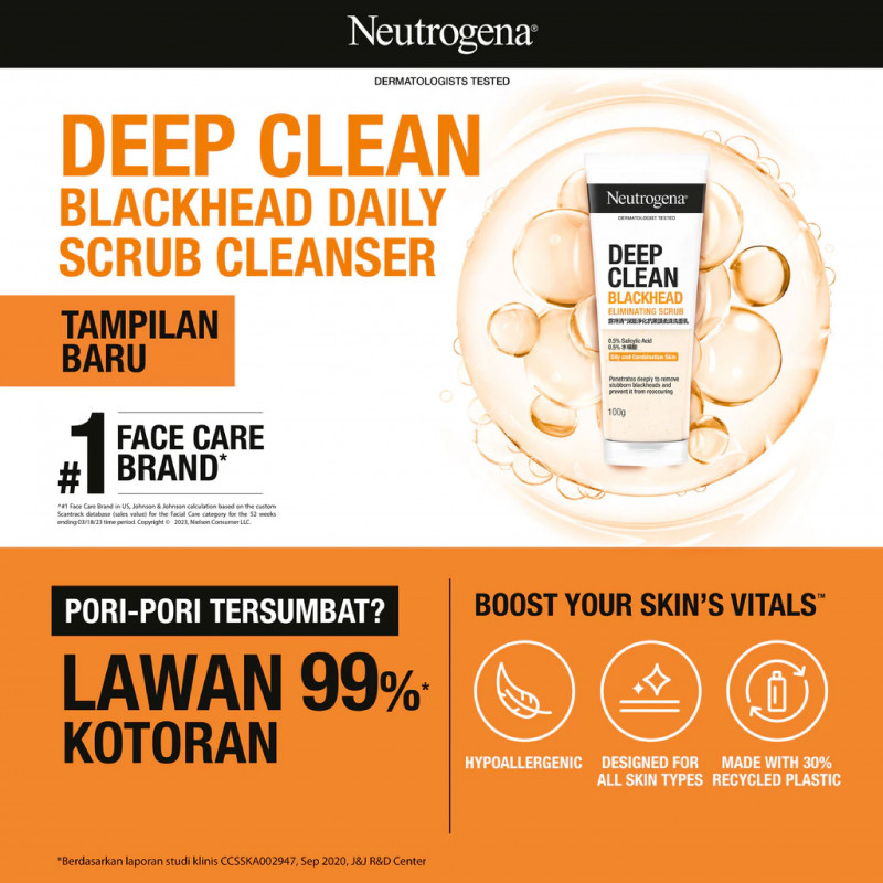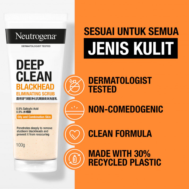 NEUTROGENA® Deep Clean Blackhead Eliminating Daily Scrub membersihkan komedo, membantu mengangkat sel kulit mati, dan MENCEGAH KOMEDO pada wajah agar kulitmu lebih bersih dan mulus.