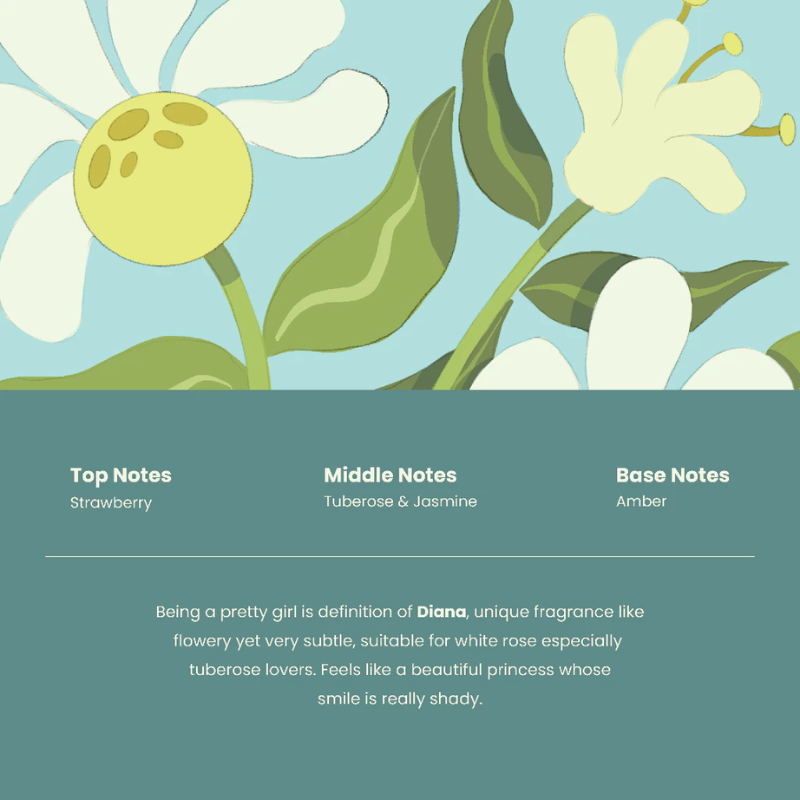 Being a pretty girl is definition of Diana, unique fragrance like flowery yet very subtle, suitable for white rose especially tuberose lovers. Feels like a beautiful princess whose smile is really shady.