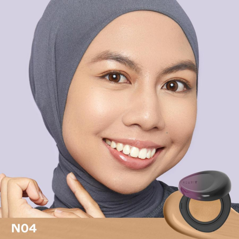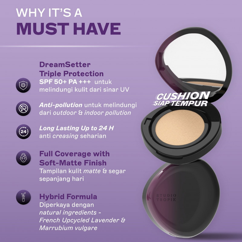 Cushion anti polusi dengan kandungan French Upcycled Lavender & Marrubium Vulgare untuk menjaga kulitmu dari polusi dan sinar UV, cocok untuk aktivitas harian.