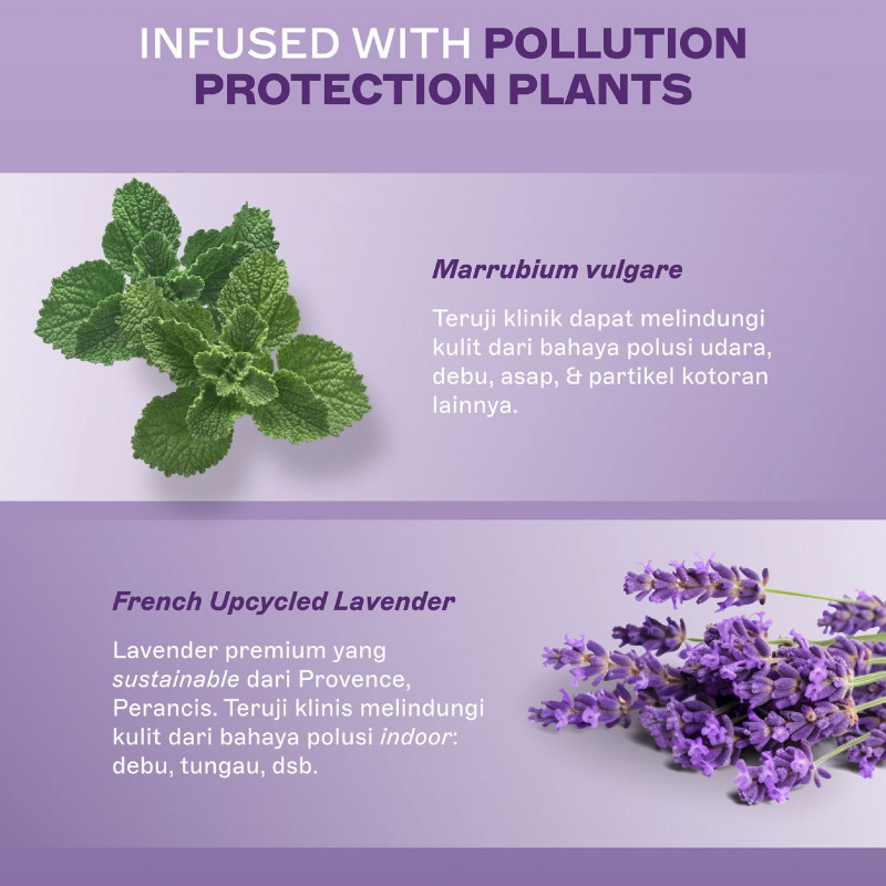 Diperkaya dengan kandungan bahan natural Pollution Protection Plants, yaitu French Upcycled Lavender & Marrubium Vulgare untuk melindungi kulit dari paparan polusi