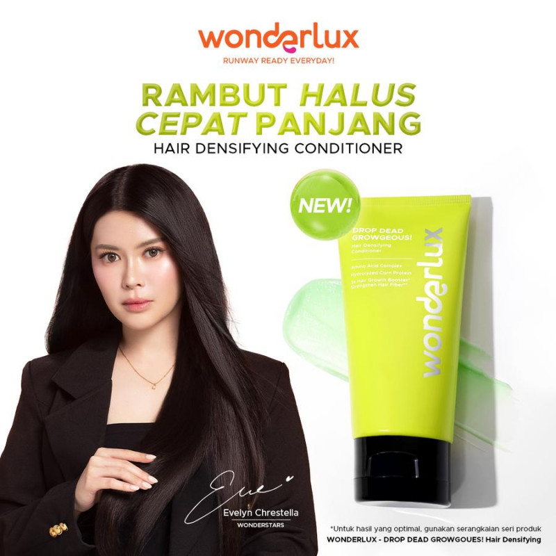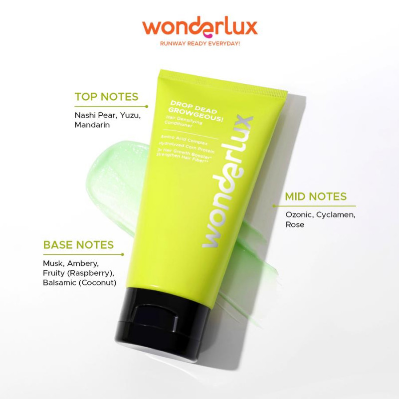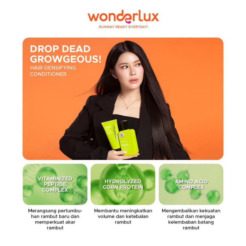 Kondisioner WONDERLUX Drop Dead Growgeous! Dengan teknologi inovatif, 3x hair growth booster yang membantu meningkatkan pertumbuhan rambut, menjadikan rambut tampak lebih lebat, sehat, dan kuat hingga ke akamya**, serta aroma mewah yang membuat rambut wangi sepanjang hari