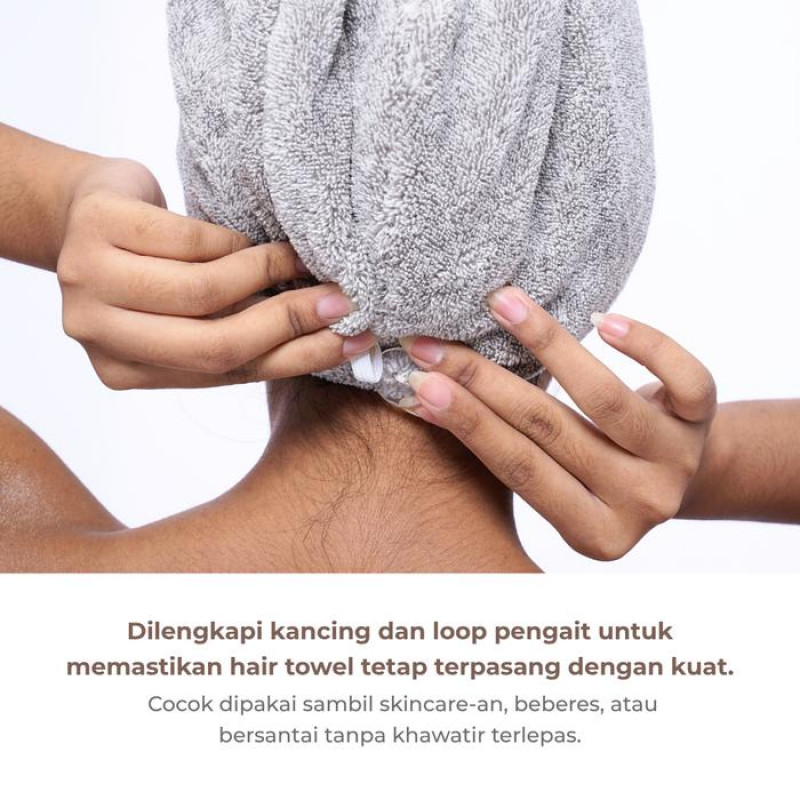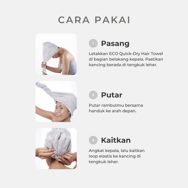 How to Use: 1. Place your ECO Quick-Dry Hair Towel over the back of your head. Place towel with button at nape of neck. 2. Twist your hair together with the towel 3. Flip head up & fasten elastic loop to button at nape of neck