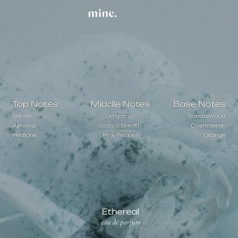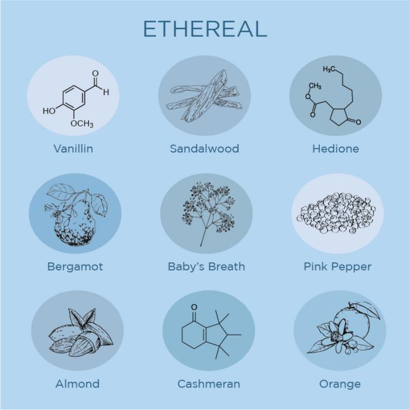 Ethereal memiliki aroma segar dengan ciri khas yang lembut, innocent, dan memorable. Kesan pertama yang diberikan adalah campuran dari buah almond, bergamot, dan vanilla. Wangi vanilla yang tidak terlalu manis (powdery) dengan kandungan aroma natural aphrodisiac mampu menarik perhatian sekitar.
