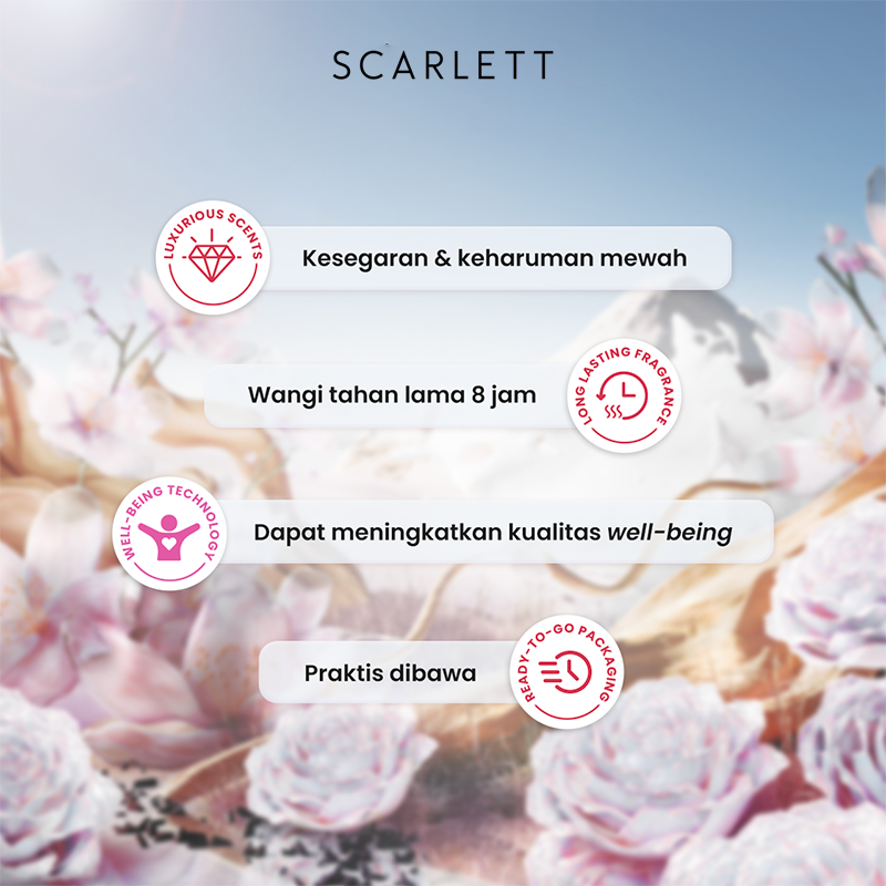 Semprotkan Scarlett Whitening Eau De Parfum Dreamy / Sweet Memories di area titik nadi dan area leher agar wangi tahan lebih lama.
