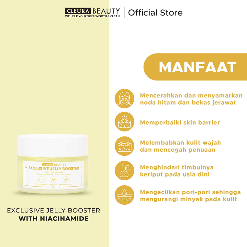 Exclusive Jelly Booster with Niacinamide merupakan Moisturizer Gel dengan fokus utama untuk membantu menjaga kelembaban kulit, membantu memperkuat skin barrier, mencerahkan kulit, serta menenangkan kulit kemerahan. Dengan hero ingredients Ceramide, 3x HyaluronicAcid, Niacinamide, sebagai ingredient terbaik untuk menutrisi kulit.