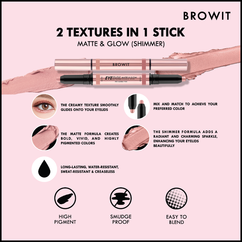 BROWIT MATTE & GLOW SHADOW STICK, Eyeshadow 2 warna dalam satu stick. Menggabungkan formula matte dan glow dalam satu kemasaan. Pigmentasi tinggi & mudah digunakan
