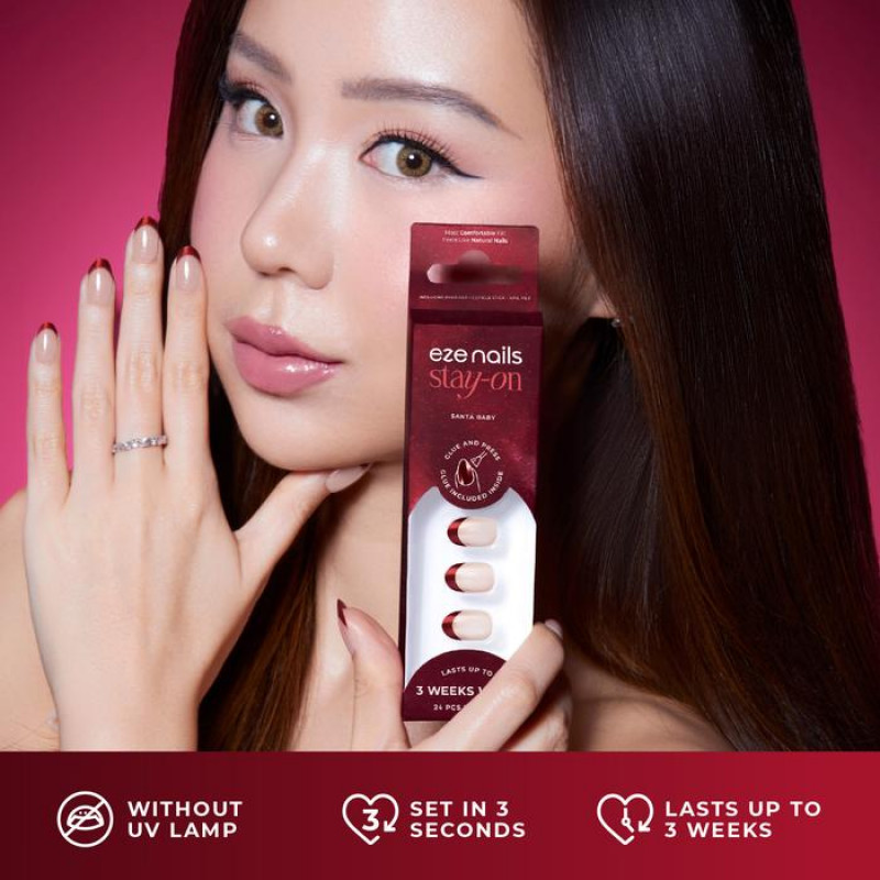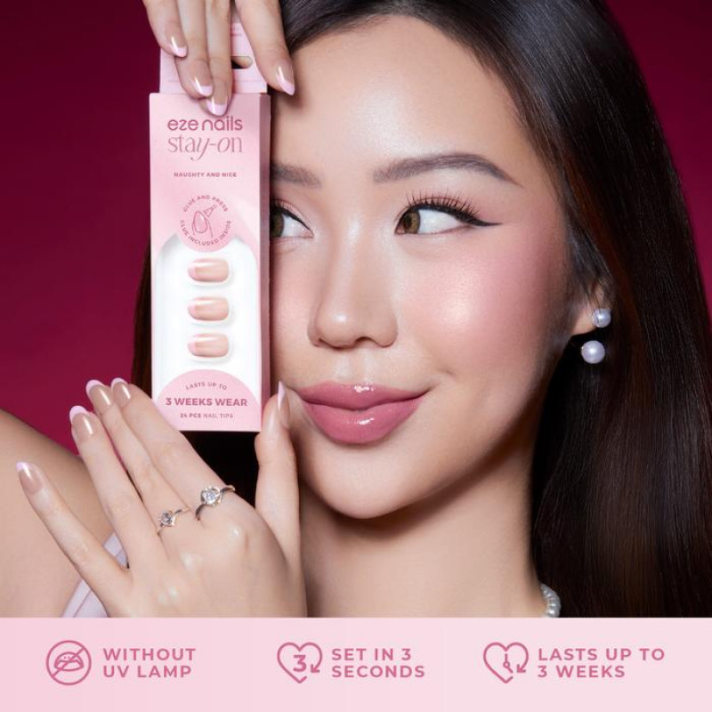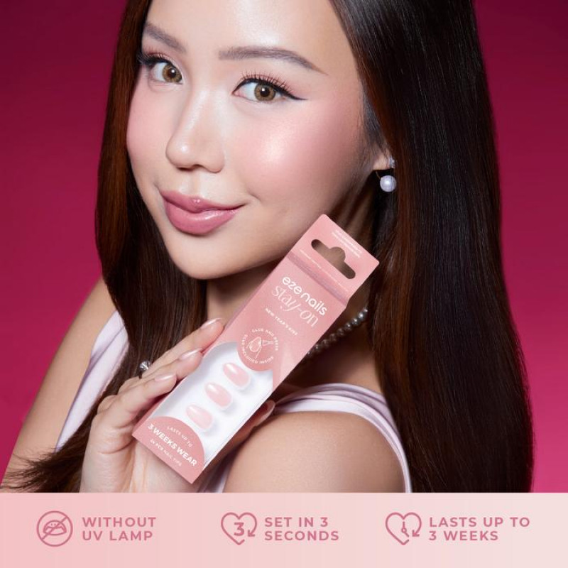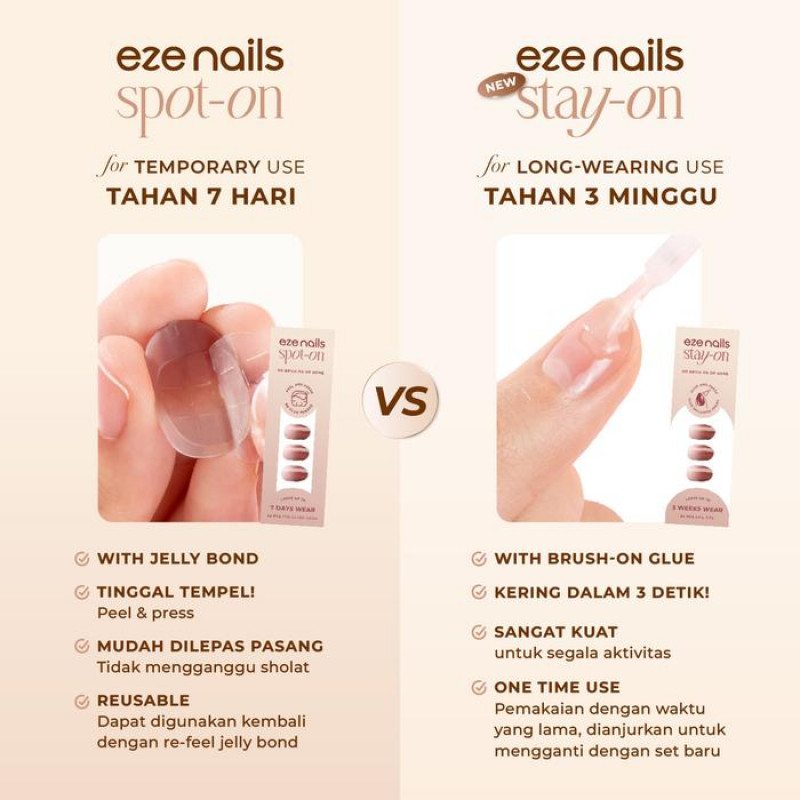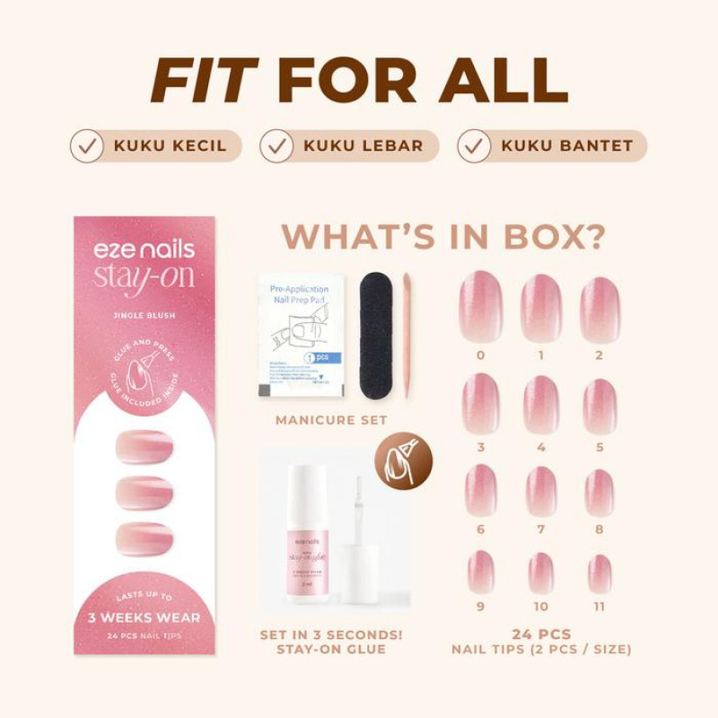 Eze Nails Stay-On Nails adalah kuku cantik dan tahan lama dengan hasil akhir seperti gel salon yang terbuat dari material super ringan, dan mampu bertahan hingga 2–3 minggu pemakaian, tanpa perlu ke salon atau menggunakan UV light.