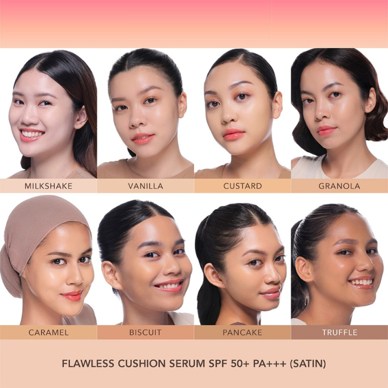 ESQA Flawless Cushion Serum SPF 50+ PA+++ Satin adalah cushion 3-in-1 dengan tekstur yang creamy & blendable. Menggabungkan full coverage, skincare premium, dan perlindungan sinar UV broad-spectrum.