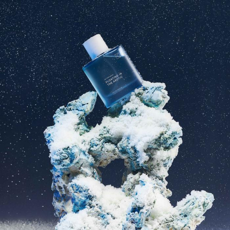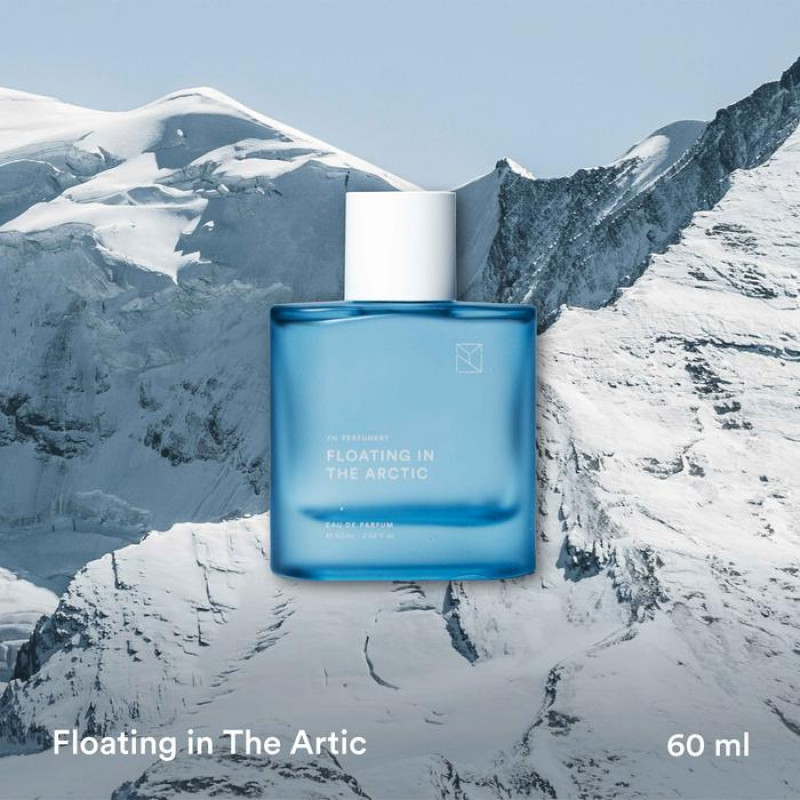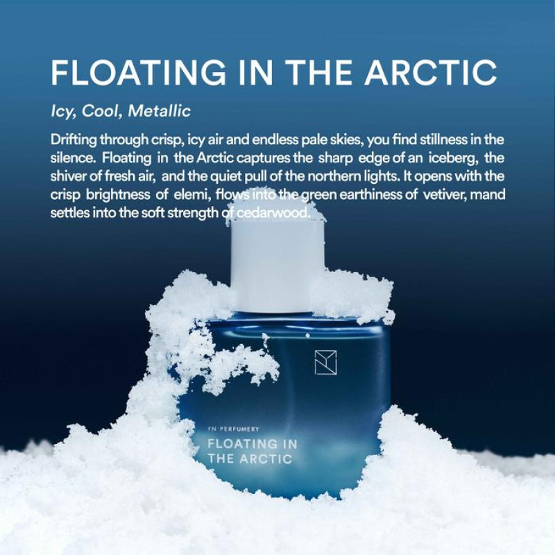YN Perfumery presents Floating in the Arctic, from "In the Middle of Nowhere" collection—a story of contrast, connection, and duality. Drifting through the silent, frozen landscape, where the sky glows in shades of electric blue and silver, Floating in the Arctic captures the sharp elegance of the North. Ice-cold winds carry a crisp, metallic freshness—raw yet exhilarating. Like cool satin on skin, this fragrance is an expression of cold clarity, magnetic depth, and quiet power. A scent that mirrors the edge of an iceberg, the shimmer of frost, and the stillness of ice-covered terrain.