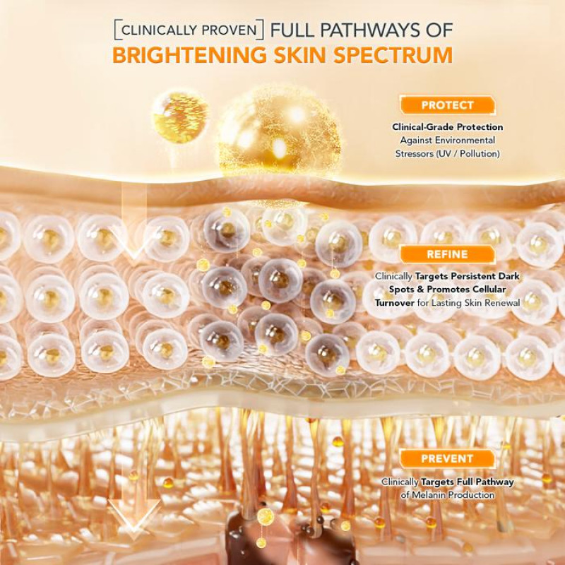 Vitamin C konsentrasi tinggi dengan GlutaBright™ + Ferulic yang efektif mencerahkan warna kulit, memudarkan tampilan noda gelap (sun spots, age spots, freckles) & tinggi antioksidan. Dilengkapi dengan kolagen untuk menjaga kekenyalan & elastisitas kulit. Kulit tampak lebih glowing, sehat & bercahaya.