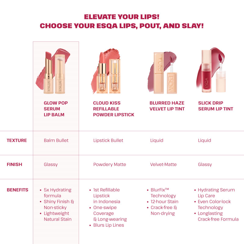 ESQA Glow Pop Serum Lip Balm adalah tinted lip balm yang melting di bibir dengan sentuhan warna yang fresh. Dengan 5X Active Complex untuk menjaga kelembapan, kenyamanan, dan melindungi bibir.
