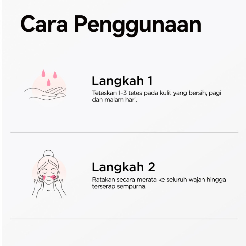 Setelah membersihkan wajah dan menggunakan toner, ambil produk 1-3 tetes ke telapak tangan. Ratakan ke seluruh wajah dan pijat lembut hingga meresap sempurna.