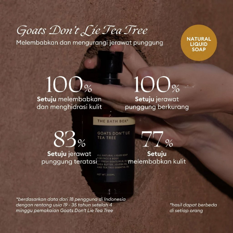 Sabun mandi natural dengan susu kambing, olive oil, shea butter dan jojoba oil untuk membersihkan kulit sekaligus menjaga kelembutan dan kelembaban kulit. Diperkaya dengan Tea Tree Essential Oil sebagai antibakteri. Goats Don't Lie Tea Tree dengan sabun cair natural, detergen free, preservative free dan dibuat dengan tangan. Cocok untuk kulit berjerawat, kulit normal cenderung kering dan punggung berjerawat.