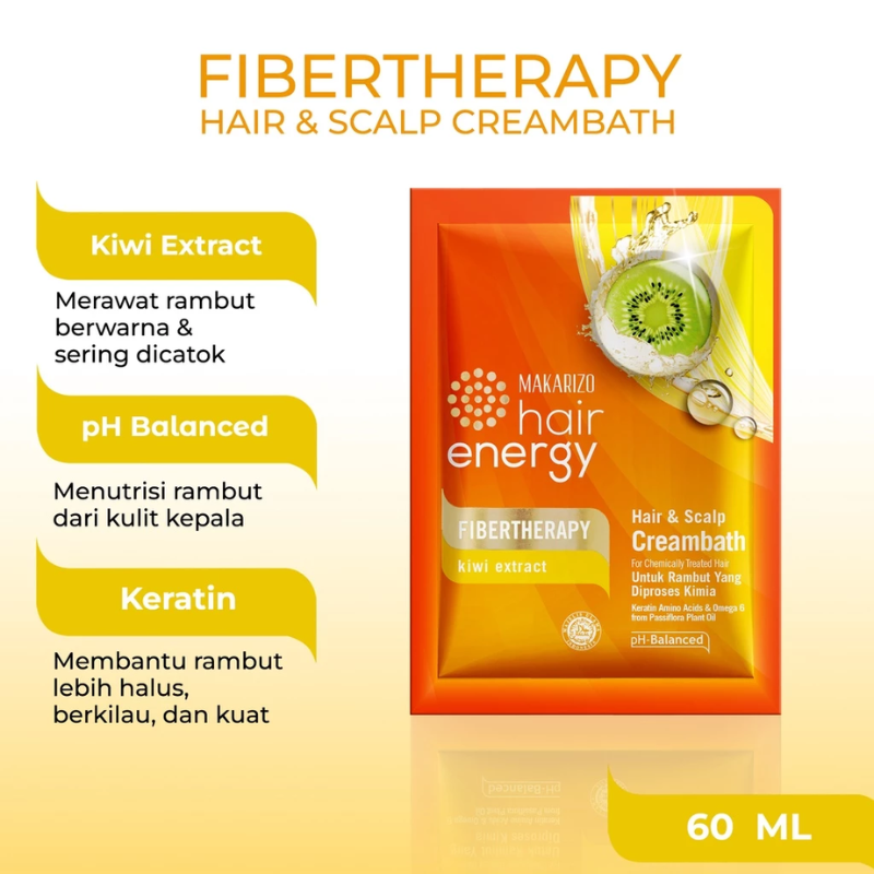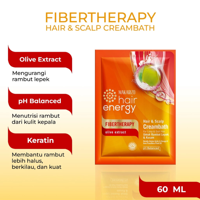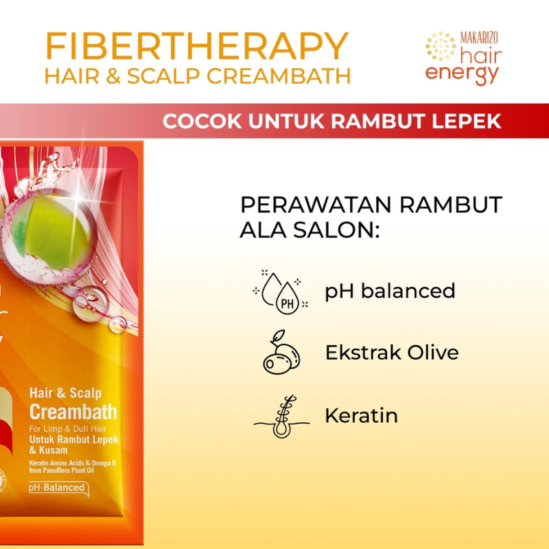 • Makarizo Hair Energy Fibertherapy Hair & Scalp Creambath hadir dengan kombinasi Omega 6 dari Minyak Nabati Passiflora dan Olive Extract dengan kandungan alami Vitamin A & E, sehingga dapat membantu menjaga lapisan keratin serta menguncikelembapan rambut dan mengurangi kelepekan pada rambut, rambut akan lebih bersinar, lembut, dan bervolume!