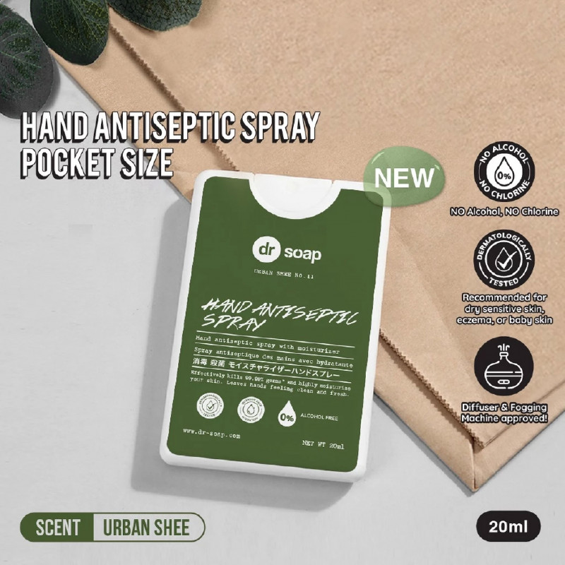 PERTAMA DI INDONESIA, dr soap Hand Antiseptic Spray sudah terbukti uji klinis disetujui oleh Dermatolog. Cairan sanitasi tangan bebas alkohol yang efektif membunuh kuman dengan aroma Urban Shee. Bebas klorin dan ramah lingkungan; aman untuk bayi dan kulit sensitif. Tangan akan terasa halus, bersih, dan segar. Antiseptik tangan ini dapat digunakan untuk rumah sakit, perawatan kesehatan, dan perawatan profesional.