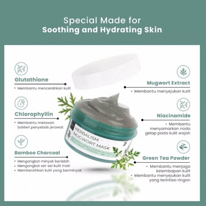 Scarlett Herbalism Mugwort Mask dapat digunakan untuk merawat kulit berminyak, pori-pori besar, berjerawat dan berkomedo. Di dalam Scarlett Herbalism Mugwort Mask terdapat kandungan Mugwort Extract, Vitamin C, Glutathione, Niacinamide, Bamboo Charcoal, Allantoin, Chlorophyllin, Green Tea Powder yang bermanfaat sebagai: