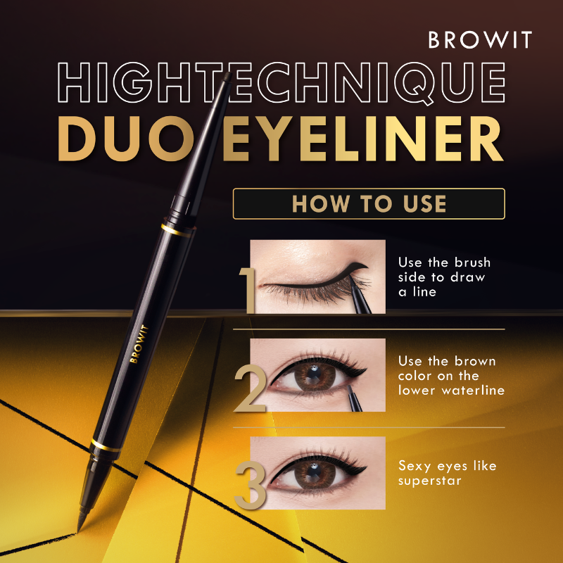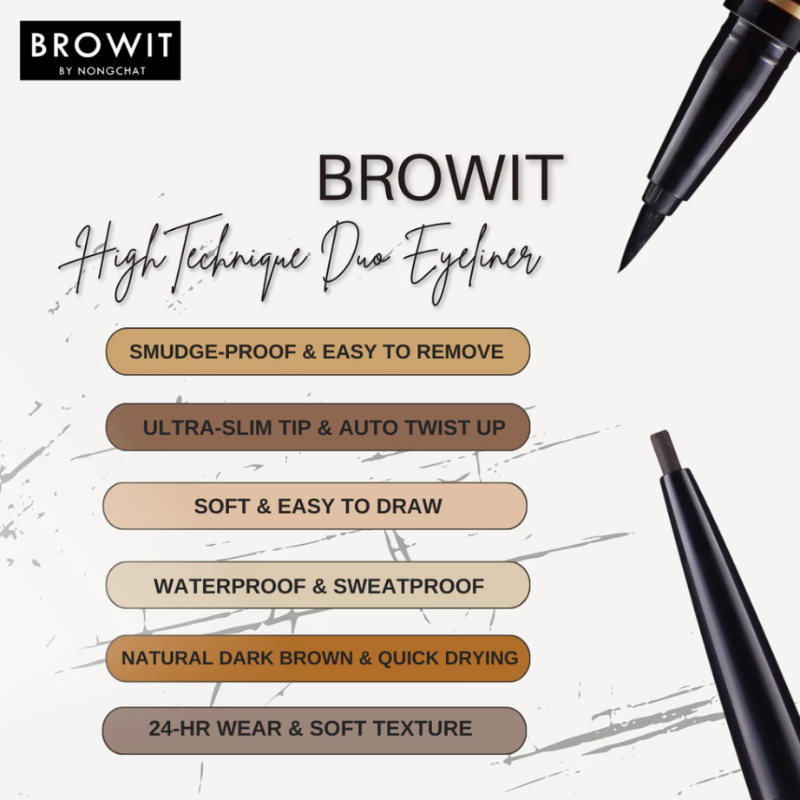 BROWIT High Technique Duo Eyeliner, Eyeliner 2 sisi dengan 2 kepala dalam satu produk. Satu sisi berupa kuas tipis yang memberikan efek tajam, cepat kering, dan tidak meninggalkan noda untuk diaplikasikan pada kelopak mata atas. Sisi lainnya berupa pensil untuk menggambar garis bulu mata bawah dengan tampilan natural, tekstur lembut, mudah digunakan, dan tahan lama berkualitas tinggi yang dipilih oleh penata rias terkemuka di Thailand.