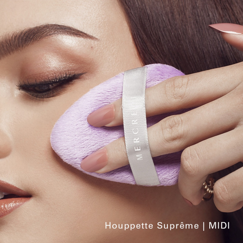 Ambil produk makeup (powder) Anda secukupnya menggunakan Houppette Supreme. Aplikasikan produk ke kulit dengan menepuk atau menggeser pelan Houppette Supreme. Maxi cocok untuk mengaplikasikan produk pada area wajah yang lebih besar