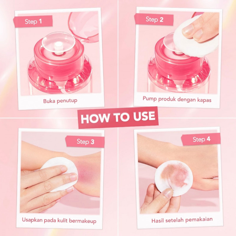 Basahi kapas dengan Hyalurose Micellar Water. Sapukan kapas dengan lembut ke seluruh wajah, mata, dan bibir, tahan selama beberapa detik di area dengan banyak riasan. Jangan menggosok terlalu keras, atau menarik, ulangi jika perlu. Dapat juga digunakan kapan saja di sela-sela pembersihan wajah. Tidak perlu dibilas.Simpan pada suhu ruang dibawah suhu 30° dan jauhkan dari paparan sinar matahari langsung.