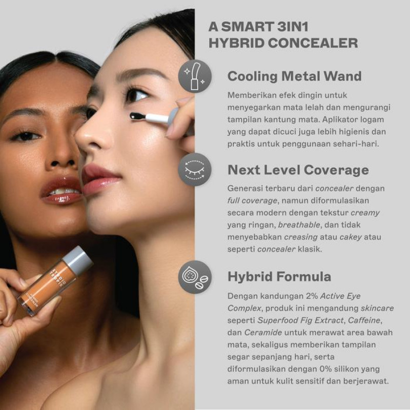 Concealer 3in1 yang inovatif dengan aplikator metal dingin, next-level coverage, serta formula hybrid dari kombinasi concealer dan eye cream. Teksturnya creamy dan ringan, mudah dibaurkan tanpa creasing. Aplikator metal dingin membantu menyegarkan mata lelah dan mengurangi kantung mata secara instan. Diperkaya dengan Fig Extract, Caffeine, dan Ceramide untuk melembapkan, mencerahkan lingkar hitam, dan menjaga kekuatan skin barrier.