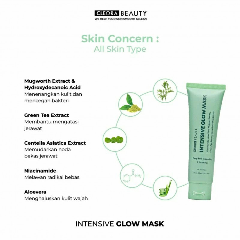 Intensive Glow Mask Merupakan Wash-Off Mask yang dapat bekerja membantu menjaga kulit dari bakteri penyebab jerawat, mengurangi peradangan pada kulit wajah, dan membantu kulit tampak lebih cerah bercahaya. Diformulasikan berbentuk Gel yang lembut dan mengering dengan cepat.
