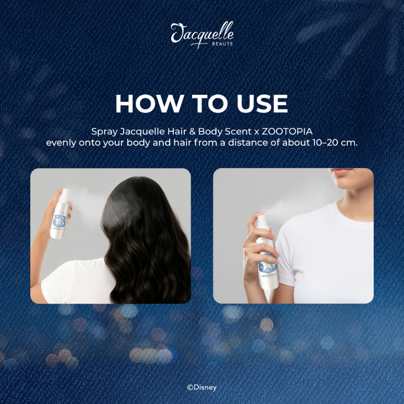 - Semprotkan Jacquelle Hair & Body Scent x ZOOTOPIA ke tubuh dan rambut secara merata dengan jarak sekitar 10-20 cm.