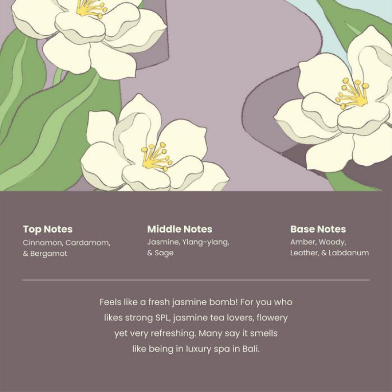 Feels like a fresh jasmine bomb! For you who likes strong SPL, jasmine tea lovers, flowery yet very refreshing. Many say it smells like being in luxury spa in Bali.
