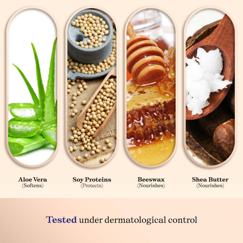 INGREDIENTS : AQUA (WATER). PARAFFINUM LIQUIDUM. STEARIC ACID. PALMITIC ACID. GLYCERYL STEARATE SE. TRIETHANOLAMINE. CERA ALBA (BEESWAX). CETYL PALMITATE. BUTYROSPERMUM PARKII (SHEA) BUTTER. 1,2 HEXANEDIOL. CAPRYLYL GLYCOL. STEARETH-10. POLYACRYLAMIDE. C13-14 ISOPARAFFIN. PARFUM (FRAGRANCE). LAURETH-7. PROPYLENE GLYCOL. TROPOLONE. HYDROLYZED SOY PROTEIN. ALOE BARBADENSIS LEAF EXTRACT.