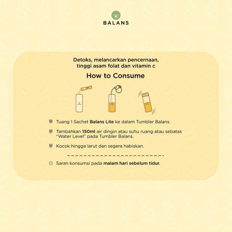 Saran Konsumsi : Balans Lite dapat diminum malam hari sebelum tidur. Cara Penyajian : Tuang 1 sachet Balans Lite dalam botol berisi 150 ml air biasa/air dingin. Kocok hingga larut.