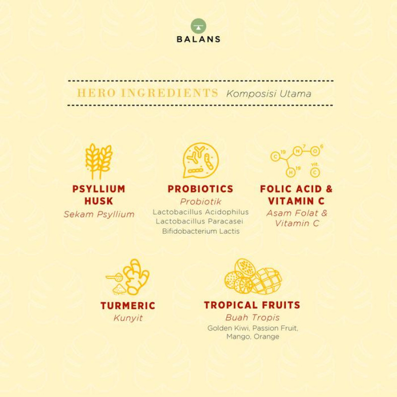 Komposisi Utama : Tropical Fruits Extract, Golden Kiwi Extract, Turmeric Extract, Apricot Extract, Psyllium Husk, Lemon Extract, Passion Fruit Extract, Brussel Sprout Powder, Okra Powder, Lentil Powder, Inulin, Lactobacillus Acidophilus, Lactobacillus paracasei, Bifidobacteriun Lactis, Vitamin D3, Vitamin E, Zinc, Vitamin and Mineral Premix.