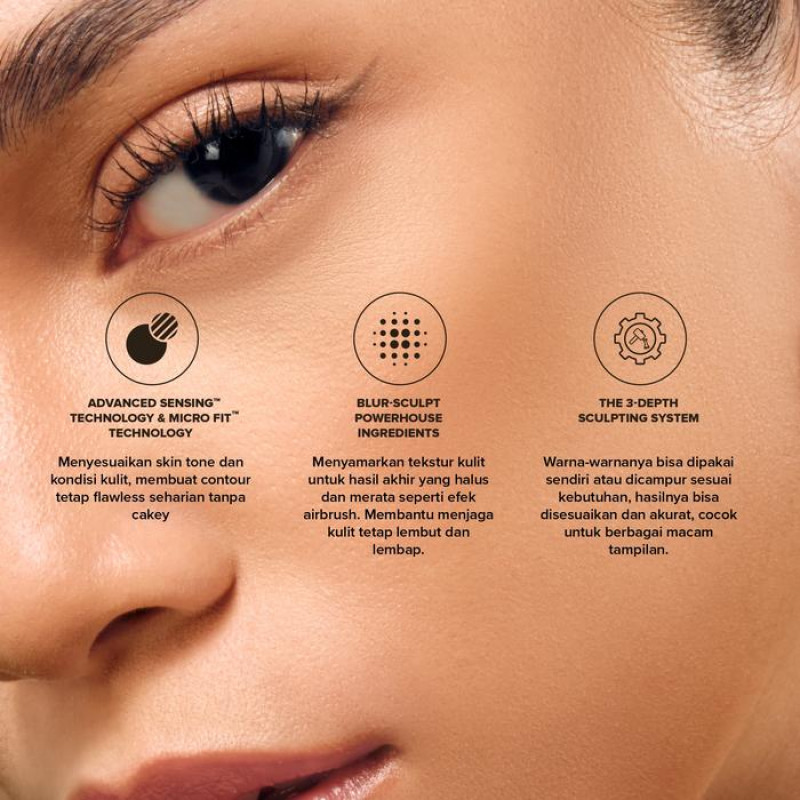 Dengan Micro Fit™ Technology dan Advanced Sensing™ Technology, Tri-Shade contour ini menyesuaikan dan menyatu sempurna dengan warna kulit seiring pemakaian, memberikan efek sculpting sempurna yang smooth dan natural.