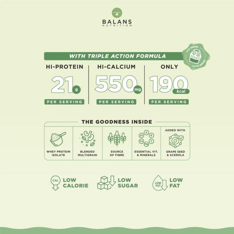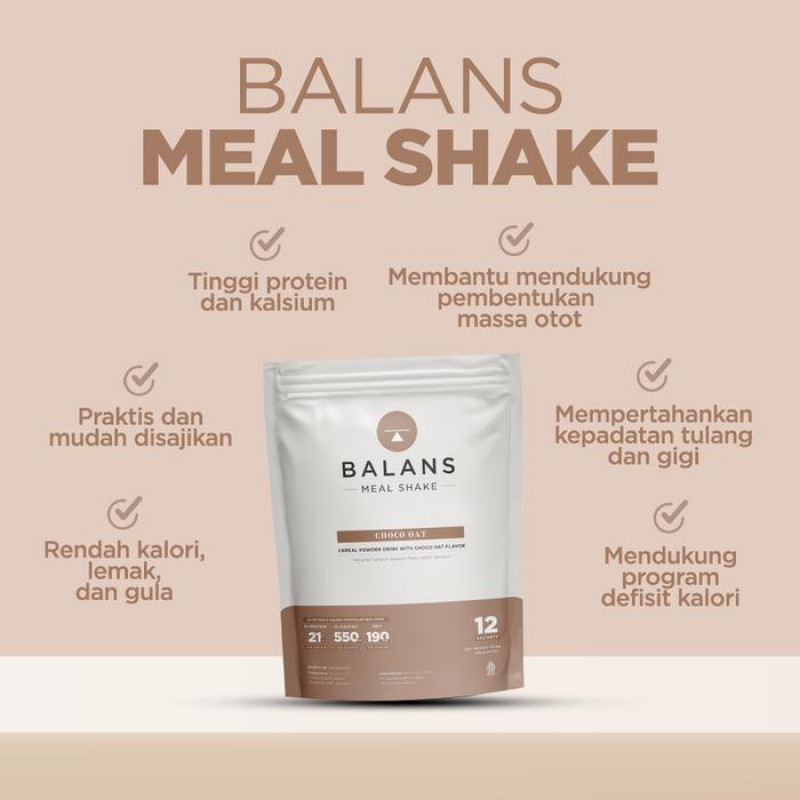 Balans Meal Shake adalah minuman sereal rasa cokelat dengan Triple Action Formula dapat dinikmati sebagai susu protein tinggi kalsium dan pengganti makanan yang rendah kalori untuk memenuhi gizi harian, mendukung pembentukan otot, dan kepadatan tulang.