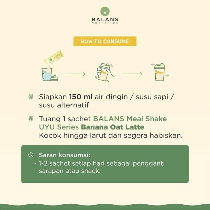 Saran Konsumsi 1-2 sachet/hari sesuai kebutuhan: Pagi: sebagai pengganti sarapan Siang/sore: pengganti camilan tinggi kalori, seperti gorengan/boba Malam: Ketika lapar di malam hari Cara Penyajian: - Tuang 1 sachet Balans Meal Shake ke dalam botol berisi 150ml air.