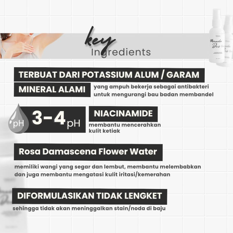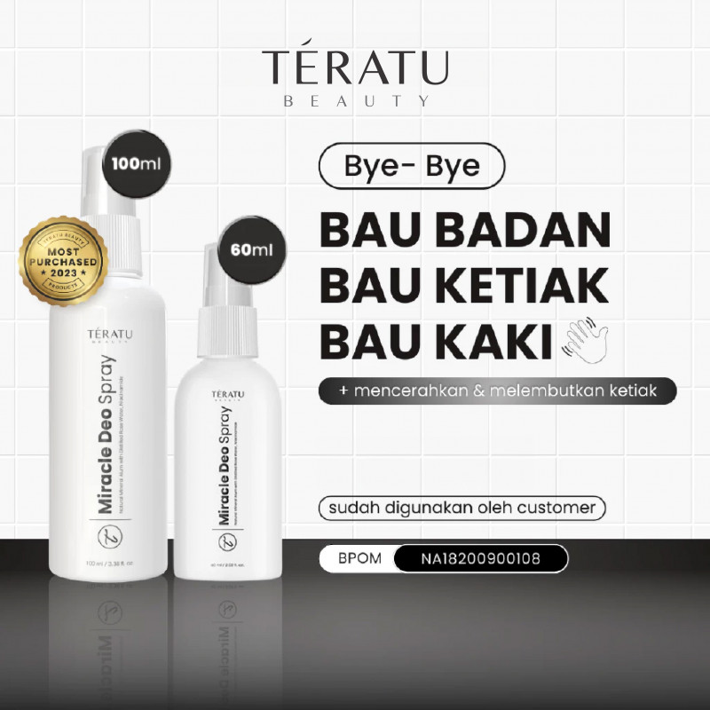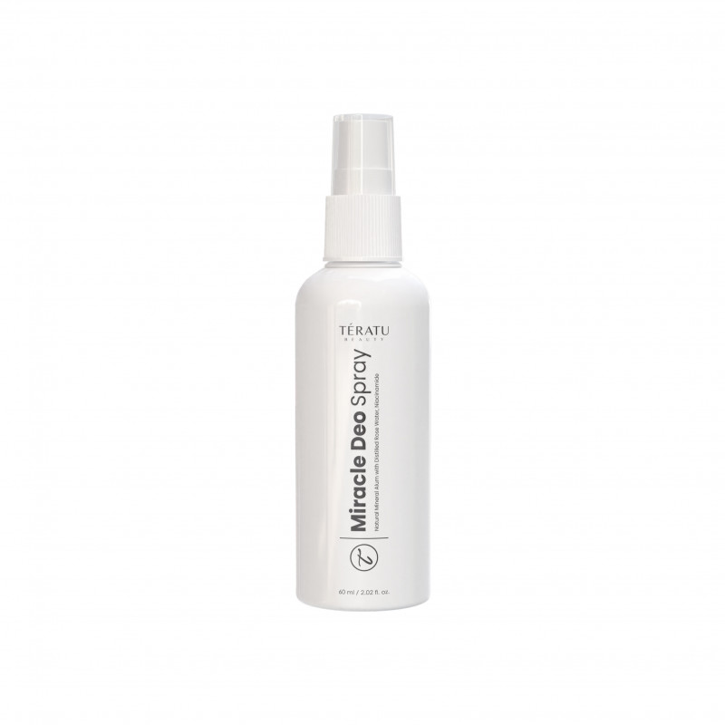 TERATU BEAUTY Miracle Deo Spray secara praktis dapat menghilangkan bau ketiak, bau badan, bau kaki. Juga dapat memutihkan ketiak, mengontrol keringat berlebih. Tidak lengket sehingga tidak meninggalkan noda di baju. Tidak mengandung alkohol sehingga aman untuk bumil & busui. Ditambahkan kandungan extract bunga mawar yang bagus untuk kesehatan kulit.