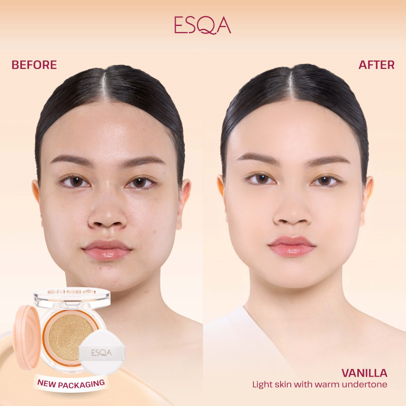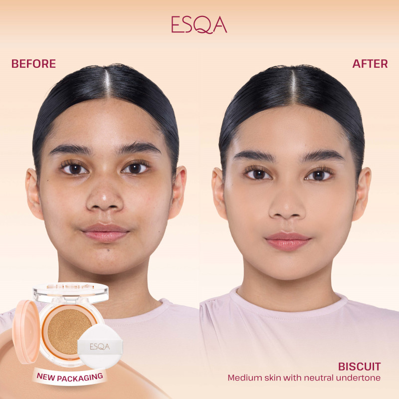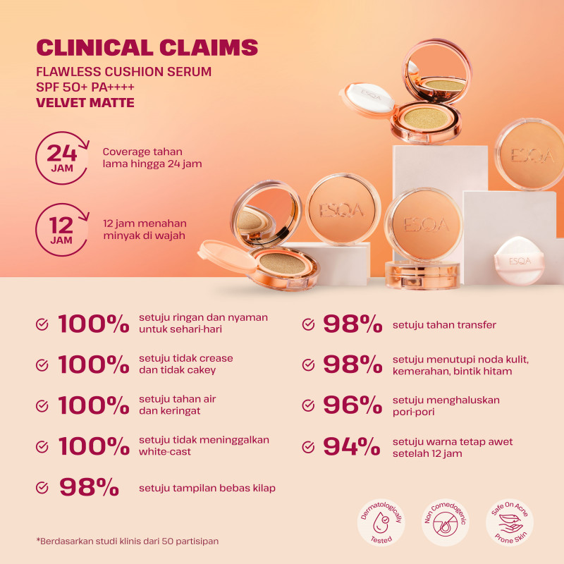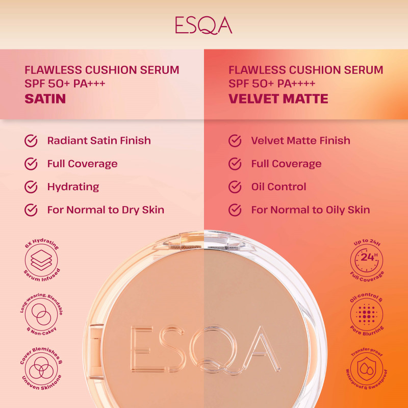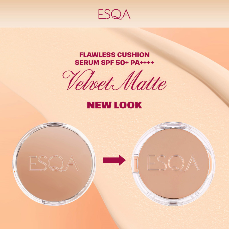 ESQA Flawless Cushion Serum SPF 50+ PA++++ Velvet Matte adalah cushion full coverage yang menghaluskan kulit, mengontrol minyak, menyamarkan pori, dan oksidasi minimal dengan Minimulsion邃「 Technology.