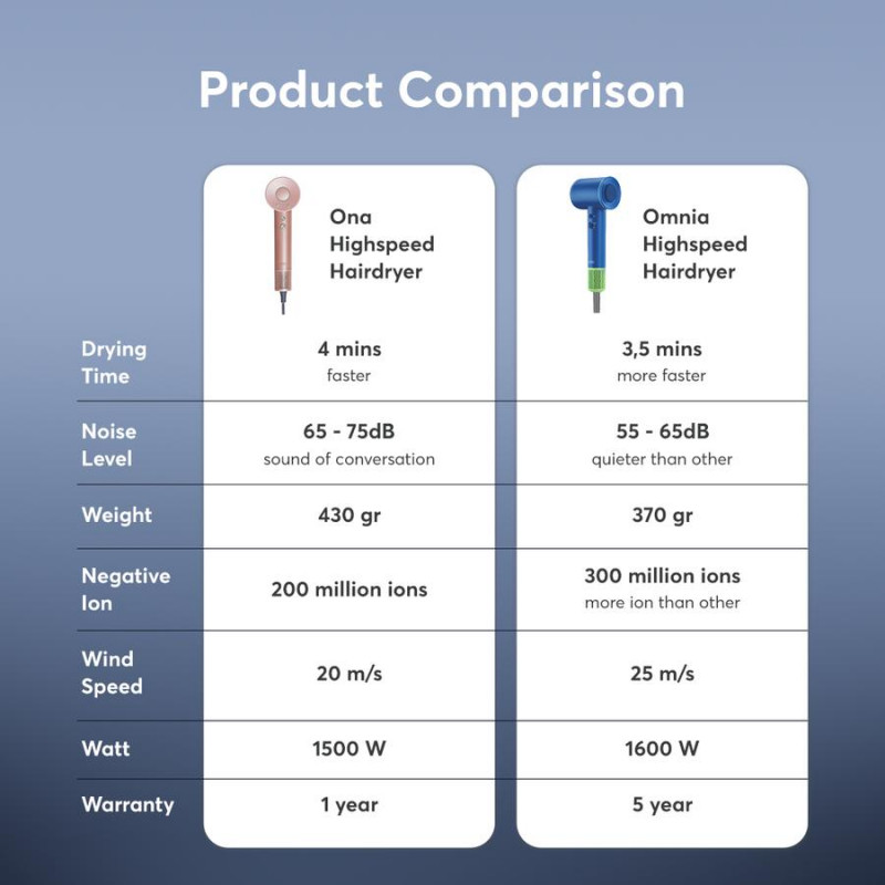 Omnia adalah upgraded version dari highspeed hairdryer ONA sebelumnya. Dalam kehidupan yang serba cepat, Omnia hadir untuk memberikan solusi mengeringkan rambut yang elegan dan efisien. Dengan teknologi canggih, Omnia dapat mengeringkan rambut hanya dalam 3,5 menit. Dilengkapi dengan Smooth Nozzle Magnetic dan 5 pilihan warna unik.
