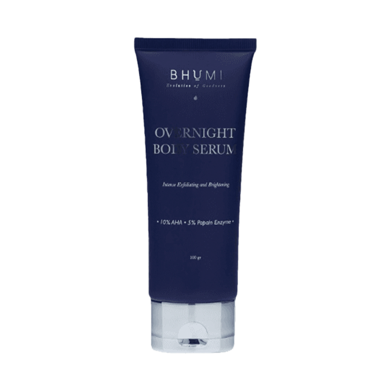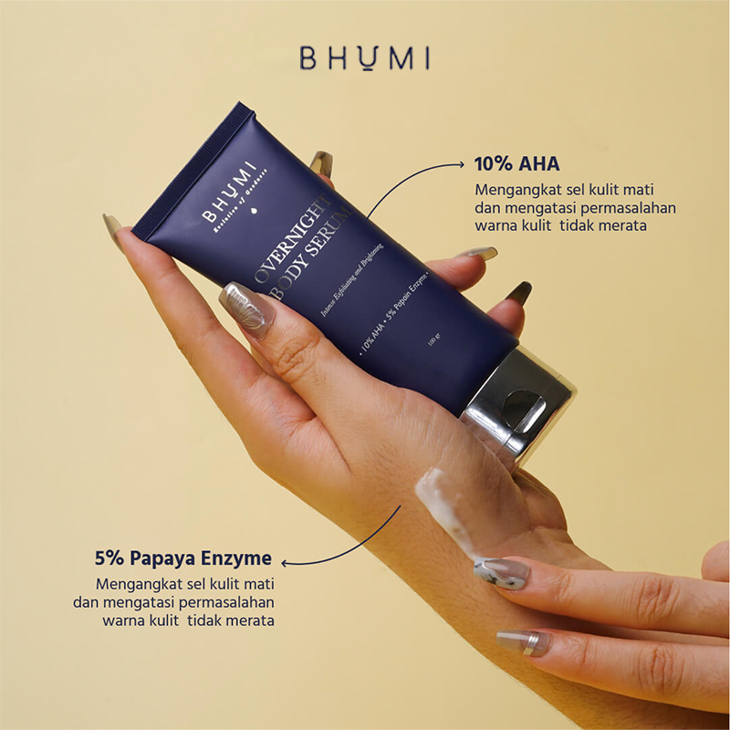 An Exfoliating Body Serum works perfectly to slough dead skin and brightens the overall complexion for your skin. 1. 10% AHA (glycolic dan lactic acid) berfungsi untuk mengangkat sel kulit mati dan mengatasi permasalahan seperti warna kulit tidak merata, hiperpigmentasi, noda hitam pada kulit, tekstur kulit mati yang kasar, dan bekas jerawat. Kandungan ini berfungsi juga untuk melembapkan dan menghidrasi kulit. 5% Papaya Enzyme memiliki kandungan Protein, Vitamin A, dan Vitamin C yang tinggi. Enzim ini dapat secara efektif mencerahkan kulit dari dalam dan juga mengangkat sel kulit mati sebagai akibat dari paparan sinar matahari atau bekas jerawat. Kandungan Papain bekerja sebagai protein pengurai pada kulit mati, sehingga mempercepat proses pengelupasan kulit mati pada badan. Papaya Enzyme juga berfungsi menjaga kelembapan kulit dan menghidrasi kulit. Turmeric Root Oil berfungsi untuk memberikan anti peradangan pada kulit seperti eczema dan psoriasis. Turmeric Oil membantu kinerja Papaya Enzyme yang juga dapat mengurangi peradangan pada kulit sekaligus mencerahkan.