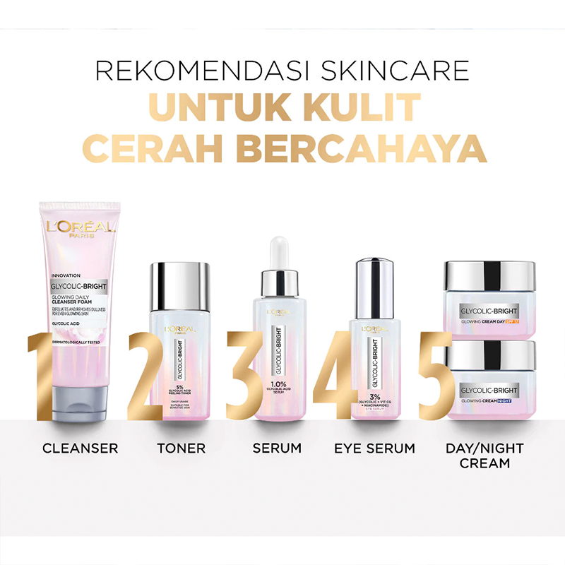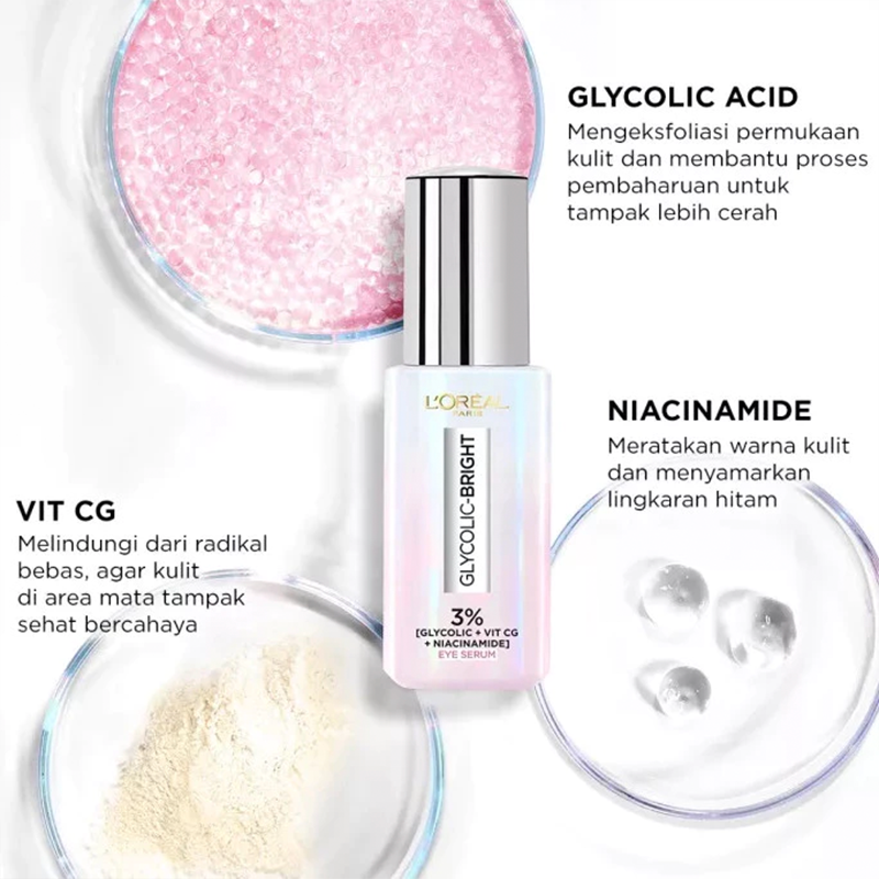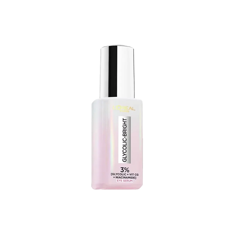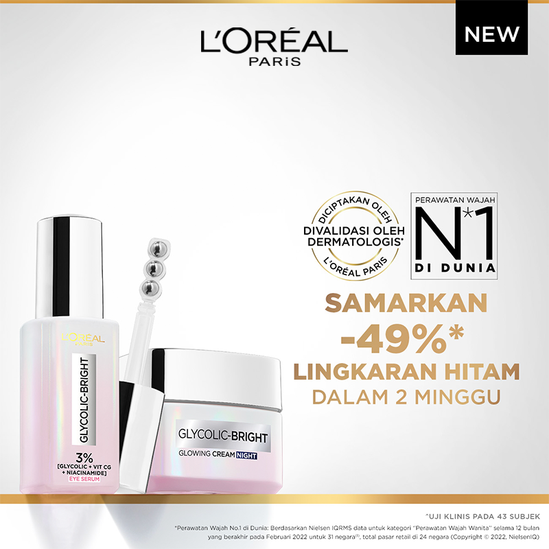 L’Oréal Skincare Laboratories mengembangkan Glycolic Bright Dark Circle Eye Serum yang diformulasikan dengan 3% (Glycolic Acid + Vitamin CG + Niacinamide). Terbukti secara klinis menyamarkan lingkaran hitam untuk mata tampak lebih segar, seperti tidur +3jam** lebih lama