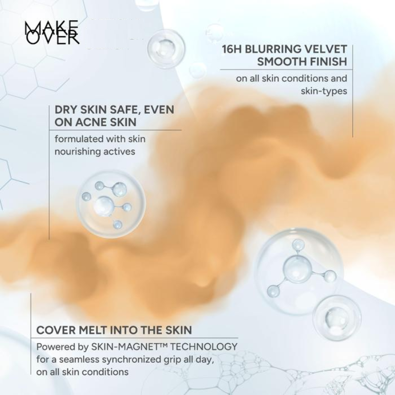 Make Over Perfect Cover Powder Foundation merupakan foundation berbentuk bedak yang dapat memberikan hasil Cover Melt and Blur Powder: bedak yang langsung “kawin” atau menyatu dengan dengan kulit dan warna langsung berbaur dengan warna kulit asli. Diformulasikan untuk cocok pada semua tipe kulit dan kondisi kulit, tahan hingga 16 jam karena dilengkapi dengan TMS film-former dan polymer-matrix. Nyaman digunakan tanpa perubahan warna complexion sehingga makeup tetap terlihat fresh sepanjang hari. Semakin lama dipakai, semakin terlihat menyatu dengan kulit. Diformulasikan dengan Skin-Magnet™ Technology, teknologi paten* terbaru dari Make Over: Make Over Perfect Cover Powder Foundation dapat memberikan makeup yang synchronized grip dimana makeup langsung menyatu dan membaur dengan kulit setelah diaplikasikan. Serta memberikan makeup yang Fail-Proof, menciptakan tampilan makeup setara dengan MUA professional pada berbagai jenis tipe kulit, meskipun digunakan oleh pemula.
