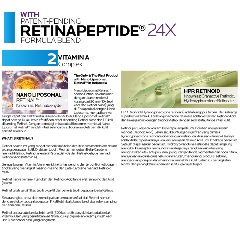 1. Nano Liposomal RETINAL™: Nano Liposomal Retinal™ adalah Retinal revolusioner dengan ukuran molekul kurang dari 30 nm (10x lebih kecil dari Retinal biasa) yang di-Enkapsulasi dengan Nano Liposome, menjadikannya sangat cepat dan efektif untuk diserap oleh tubuh. Nano Liposomal Retinal™ dapat bekerja 10 kali lebih efektif dan cepat dibanding Retinal biasa dan 110 kali dibanding Retinol. Dengan teknologi enkapsulasi liposome membuat Nano Liposomal Retinal™ rendah iritasi sehinga bisa digunakan oleh pemilik kulit sensitif sekalipun. Retinal telah teruji 11 kali lebih bioaktif dan bekerja lebih cepat daripada Retinol. Secara singkat, anda akan mendapatkan semua manfaat dari Retinol namun dengan efektivitas dan kecepatan 11 kali lebih baik, tanpa takut akan efek samping berlebih dari Retinol. Retinal secara substansial lebih aktif (500 kali lebih banyak!) daripada bentuk Vitamin A lain yang berarti bahwa Retinal cukup digunakan dalam jumlah kecil untuk mencapai hasil yang diinginkan. Manfaat Retinal yang telah diteliti adalah mengeksfoliasi sel kulit mati dan mencerahkan kulit, mengurangi minyak, anti-bakteri, merawat jerawat, anti-hiperpigmentasi, anti penuaan dini/keriput, memperbaiki lapisan epidermis/dermis dengan secara aktif merangsang produksi kolagen/elastin dan memberikan sifat anti inflamasi dan antioksidan.