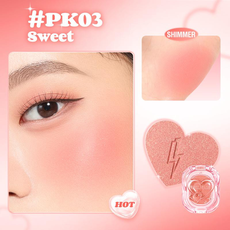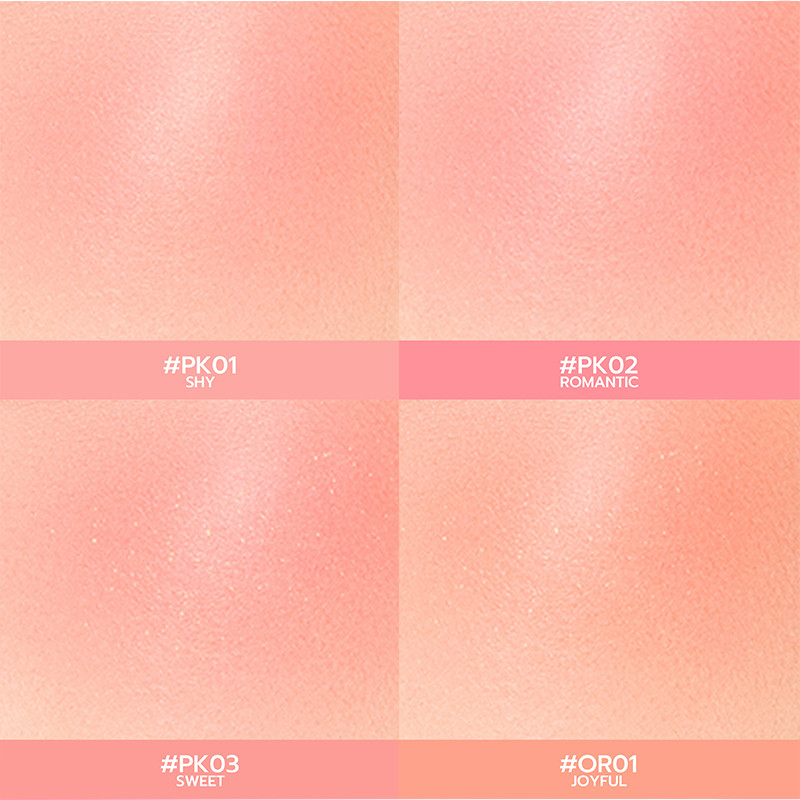1.Sweet:Put the blush on the apple muscles, then blend it in a circular motion 2.Slightly drunk:Put the blush on the middle of apple muscles and the eyes, and blend it evenly 3.Korean Style:With the eye tail as the center, it radiates to the temples. 4.sun-kissed:Starting from the middle of the cheeks, work towards the outside of the cheekbones and the middle of the bridge of the nose.