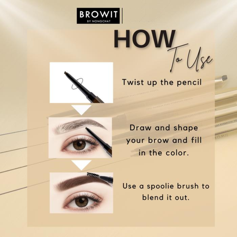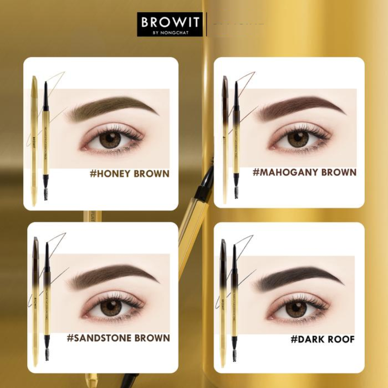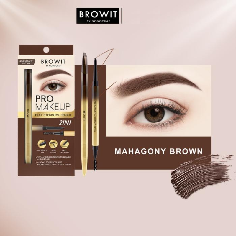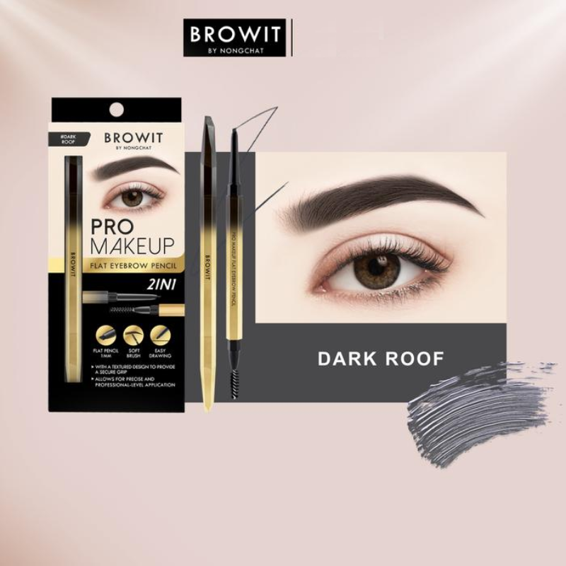 BROWIT Pro Makeup Flat Eyebrow, Dapatkan alis alami dan rapi sempurna dengan BROWIT Pro Makeup Flat Eyebrow yang inovatif ini, yang menggabungkan pensil alis dan bantalan blending dalam satu batang. Ujung pensil alis otomatisnya memiliki desain bersudut datar yang memudahkan pengaplikasian dan membantu Anda mendapatkan alis tebal dan indah yang diinginkan dengan mudah. Selain itu, ujung bantalannya membantu mempertegas tampilan alis Anda dengan kilau keemasannya untuk tampilan yang lembut dan halus. Produk ini diciptakan khusus oleh Nongchat, seorang penata rias ternama Thailand.