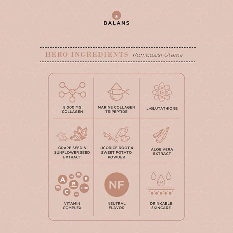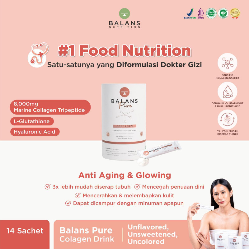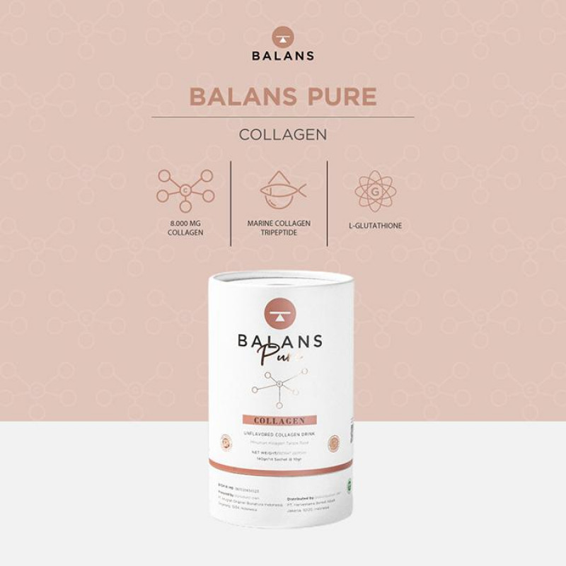 Balans Pure adalah minuman kolagen premium tanpa perasa dan tanpa pewarna (murni/pure) yang dilengkapi dengan komposisi utama yaitu L-Glutathione (mencerahkan kulit) dan Hyaluronic Acid (melembabkan kulit).